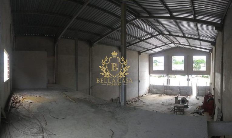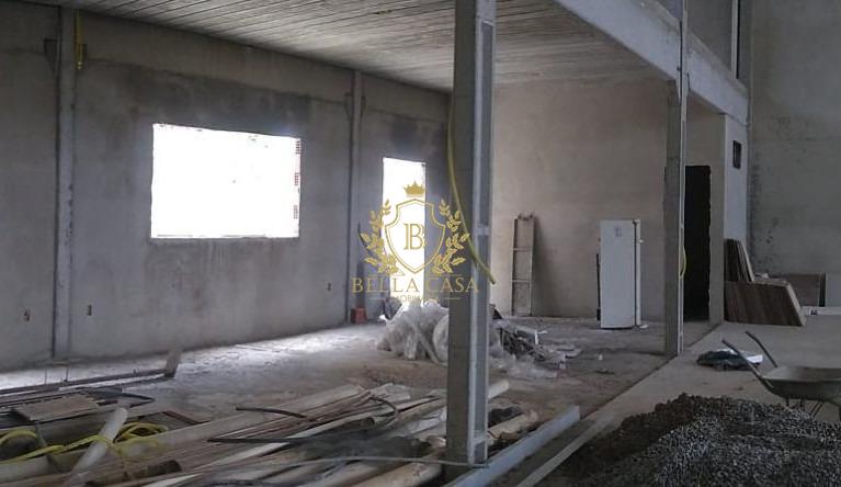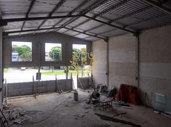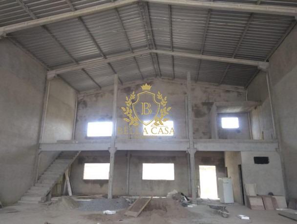 Um galpão, com 800 m², composto área livre, escritório, cozinha, 2 banheiros e mezanino.
